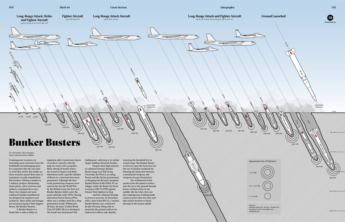 На ней представлены возможности различных видов б/п по проникновению в “толщу земли” (судя по цифрам – это грунт, а не бетон и пр.), причем начали со стрелковки (+ РПГ), а закончили, почему-то китайской БРСД МБ DF-31, пририсовали ядерную бомбу В61 (мод 12), но без каких-то “хар-к”